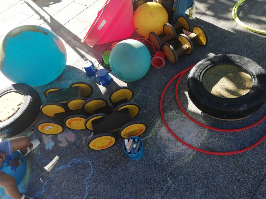 Geschicklichkeits- und Balancespielgerät mit Trittflächen und Rädern